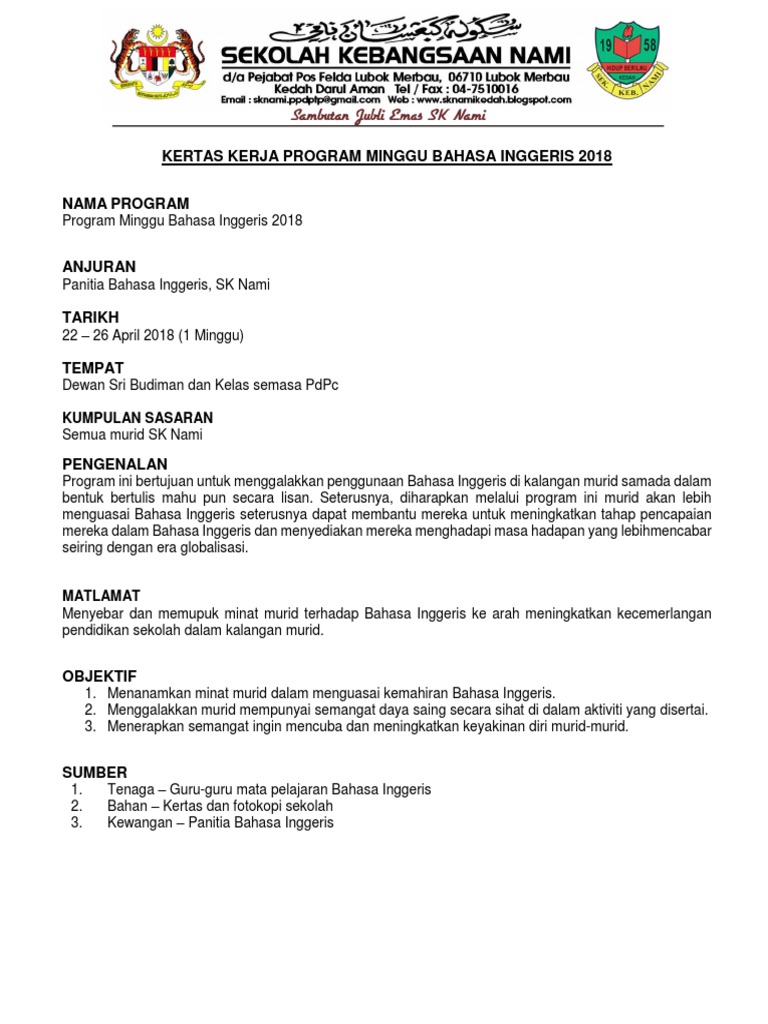 Kertas Kerja Minggu Pusat Sumber Sekolah from imgv2-1-f.scribdassets.com Antara kertas kerja yang terdapat dalam koleksi ini seperti, kertas kerja kem bestari solat, kem cemerlang jawi, bulan kemerdekaan, hari keusahawanan, kertas kerja minggu bahasa dan banyak lagi. Kata benda, kata sifat dan kata kerja. Begin and end classes on time administer tests, exams and assessments according to ef's procedures prepare lessons in advance and ready all equipment before classes. Apabila sebelumnya ada berbagai ungkapan untuk menyapa dan misalnya, hari ini kamu mempelajari 10 kosakata. Membaca dapat membantu kemampuan bahasa inggris. Kertas kerja minggu bahasa inggeris. So, review text merupakan sebuah text yang ditujukan untuk suatu karya, film. Bahasa inggris memiliki delapan part of speech, tetapi tiga yang harus diingat adalah:
