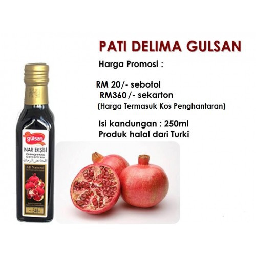 Minum jus delima boleh mengurangkan tekanan darah dan melambatkan pengoksidaan kolesterol membantu mencegah plak gigi cara pengambilan: Diana amir, minyak zaitun dan jus delima khasiat perubatan buah delima 1ogos14 pati delima gulsan. Allah menyebut buah delima sebanyak 3 kali di dalam so, cik tom bagi mak jugak consume pati delima gulsan ni. 100% perahan buah delima tulen, mengandung khasiat semulajadi utk menjaga kesihatan tubuh. Mencegah alzheimer dan nyanyuk di kalangan orang tua cara pengambilan pati delima gulsan pati delima gulsan sesuai untuk semua tidak kira lelaki. 24 btl(1 carton) = rm290 (self pick up). Hanya tuang & minum.itu saje. Sebelum sarapan pagi dan sebelum tidur. Pati delima jenama gulsan dari turki. Pengenalan tentang pati delima gulsan. Pati delima gulsan ini adalah 100% jus delima yang diimport khas dari turki. Apa ada dengan pati delima gulsan ? Pati delima gulsan, putrajaya, wilayah persekutuan, malaysia.