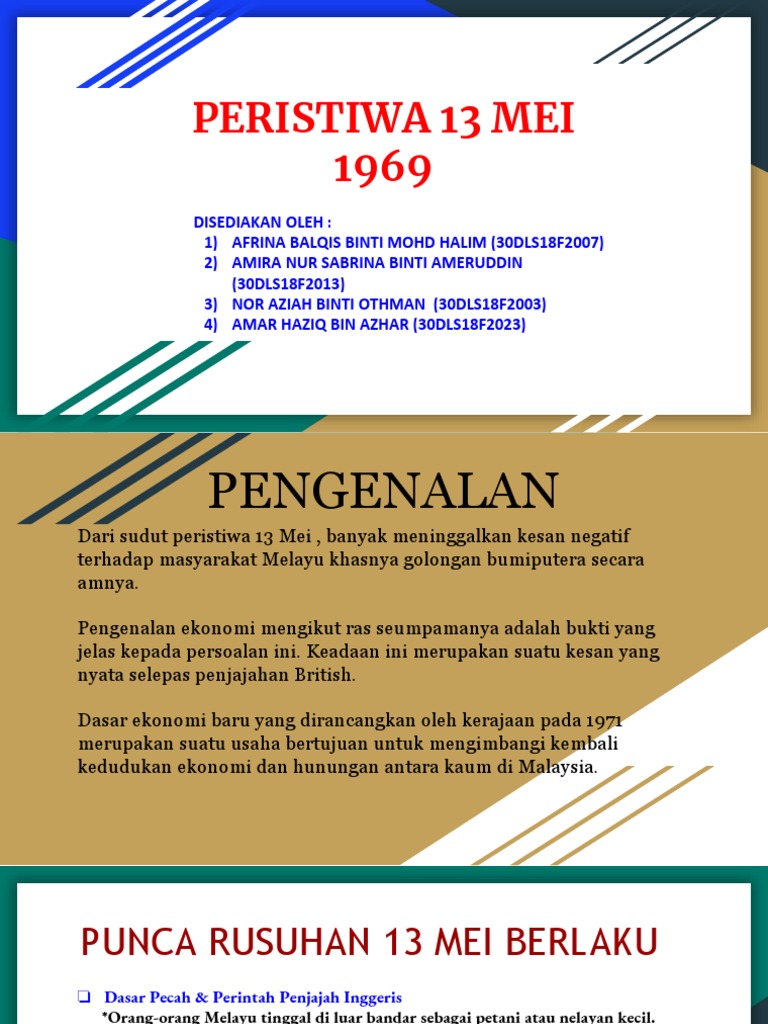 Peristiwa 13 Mei from image.slidesharecdn.com Peristiwa 13 mei pada tahun 1969 adalah rusuhan kaum yang berlaku sebagai kemuncak masalah perpaduan di malaysia. Antaranya ialah tentang isu politik, ekonomi, pendidikan dan sosial kaum. Implikasi pertama peristiwa 13 mei ialah pengisytiharan darurat. Dengan pengisytiharan itu, perlembagaan persekutuan digantung. Peristiwa 13 mei 1969 merupakan satu tragedi berdarah yang banyak meninggalkan kesan terhadap politik, ekonomi dan sosial masyarakat malaysia. Sebab terjadinya peristiwa 13 mei 1969 adalah perarakan kemenangan pihak pembangkang. Peristiwa 13 mei 1969 ialah rusuhan kaum yang berlaku antara kaum melayu dengan cina dan kemuncak masalah perpaduan di malaysia. Pengenalan ekonomi mengikut umumnya, adalah bukti yang jelas kepada persoalan ini.